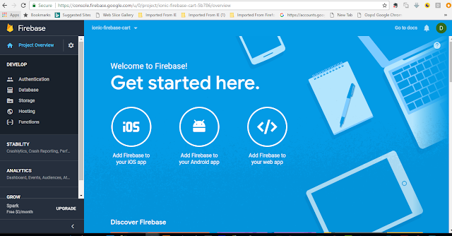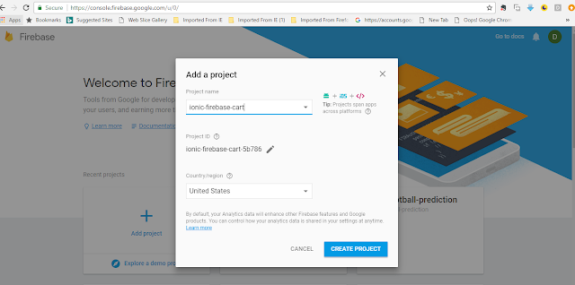 The first thing is to setup the firebase project for the app. Head on over to firebase console and click " Add new project". Give the project a name, i have named my own "i onic-firebase-cart" then click " Create Project Button"