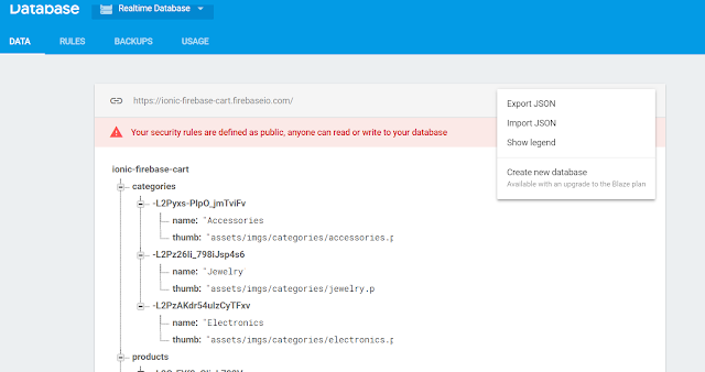The " ionic-firebase-cart.jon" is the firebase database that we will be using. Login to your firebase account and select database, in the top right click "Import JSON"