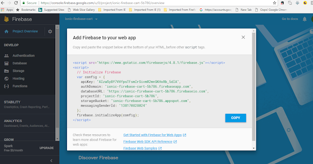 Click on "Add Firebase to your web app" and copy the snippet provided into a text file as we will be using it in our ionic app shortly.