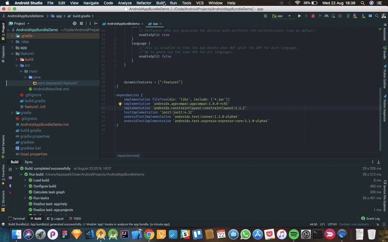 Please note that Android App Bundle requires Android Studio 3.2 or above. At the time of writing this article, the latest beta version was Android Studio 3.2 Beta 5, so I’m gonna stick with the Android Plugin for Gradle 3.2.0-beta05 for this article.