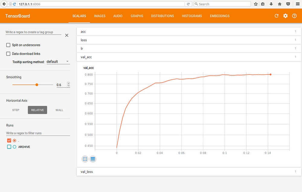 You can see we quickly start to pass the point of diminishing returns at around 35 epochs and 79%. The rest of the time is spent getting it to 81.40% and likely overfitting at anything beyond 75 epochs.