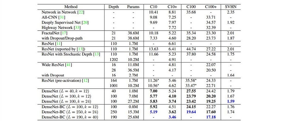 The current state of the art is DenseNet, which won the ImageNet contest last year in 2016. It chews through CIFAR10, hitting a killer 94.81% accuracy with an insanely deep 250 layers and 15.3 million connections! It is an absolute monster to run. On a single Nvidia 1080GTX, if you run it with the 40 x 12 model which hits the 93% accuracy mark you see in the chart below, it will take a month to run. Ouch!