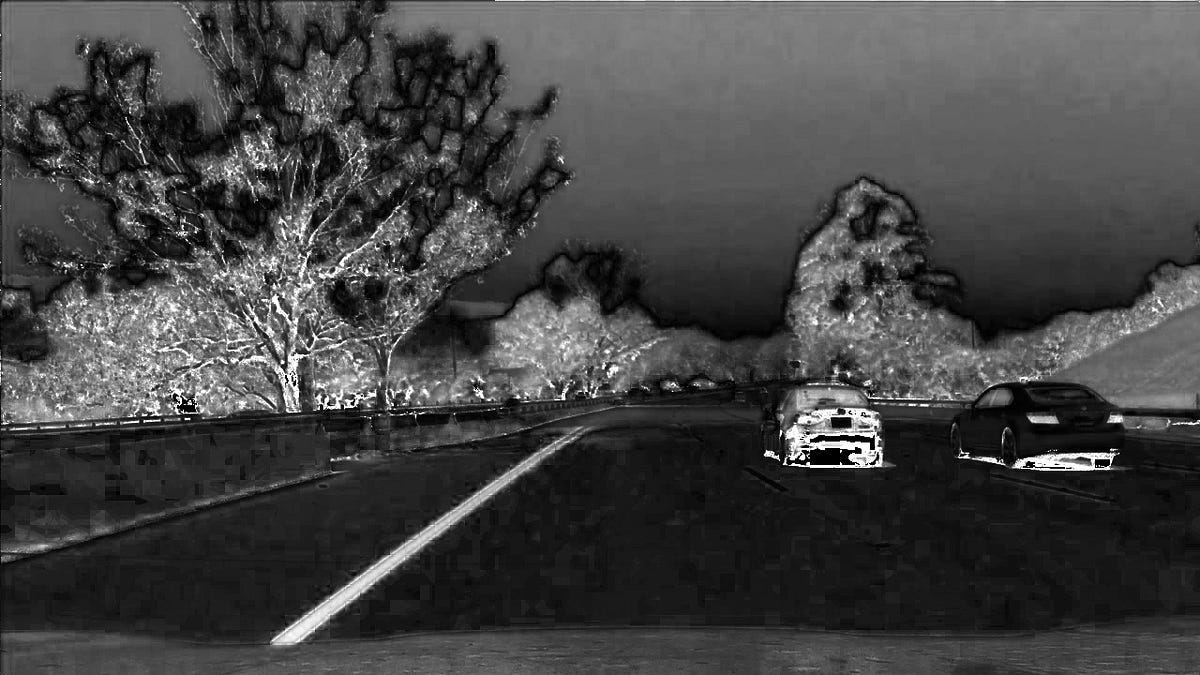 RGB image (left) and a visualization of the S channel (right) for an HSV image. S is for Saturation in HSV — you can see how the line on the left stands out a lot.