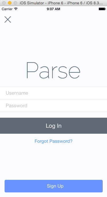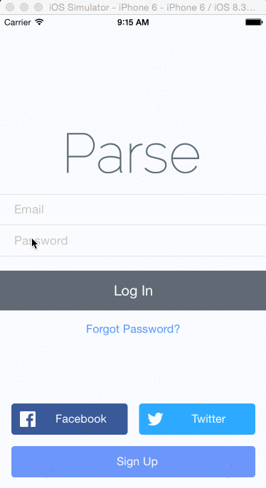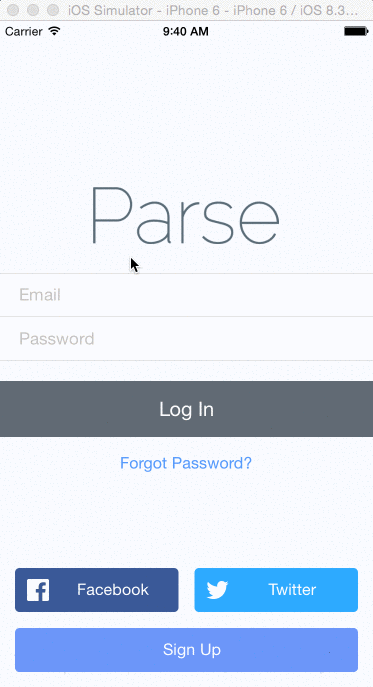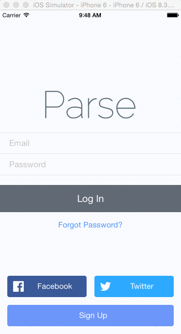 Here we implement ParseUI’s PFLoginControllerDelegate. Then in the viewDidAppear we check if the currentUser() is empty and if so, we create an instance of the ParseUI PFLogInViewController, set our self as the delegate and present it. If you run the app you should see the following: