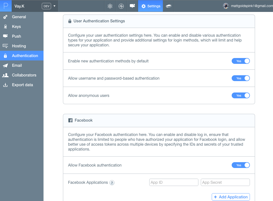 Once your app is created click on the Cog in the top right and choose Settings. On this next screen choose Authentication from the menu on the left and you’ll see the following:
