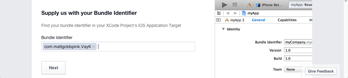 On the same page scroll down and you’ll see Supply us with your Bundle Identifier - fill this in with your project’s Bundle Identifier