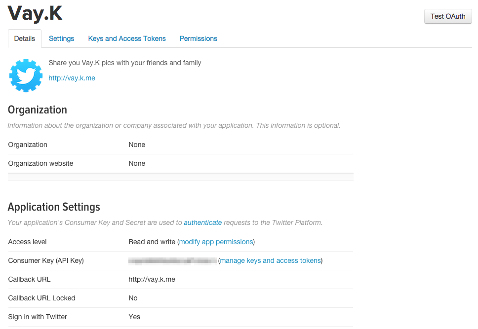 Once that is done, you’ll be presented with the App Details screen from which you can copy the Consumer Key (API Key)