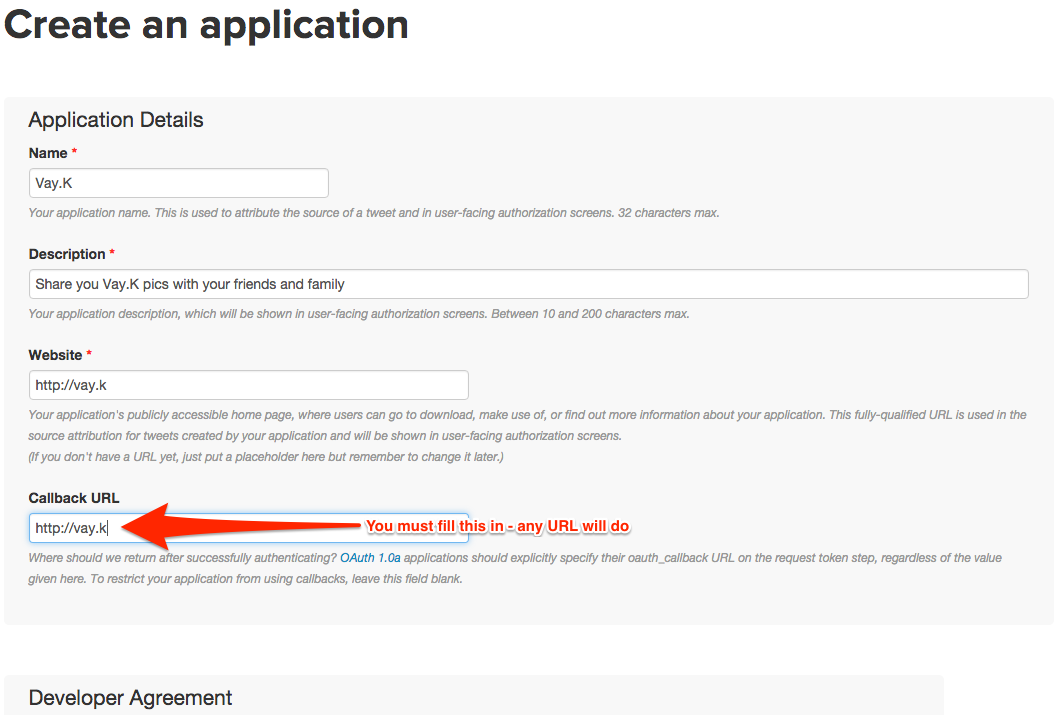 Next, fill in the app details. It’s important for the Callback URL to be filled in with something, even though it isn’t marked as a mandatory field. Check the developer agreement and then click Create your Twitter application