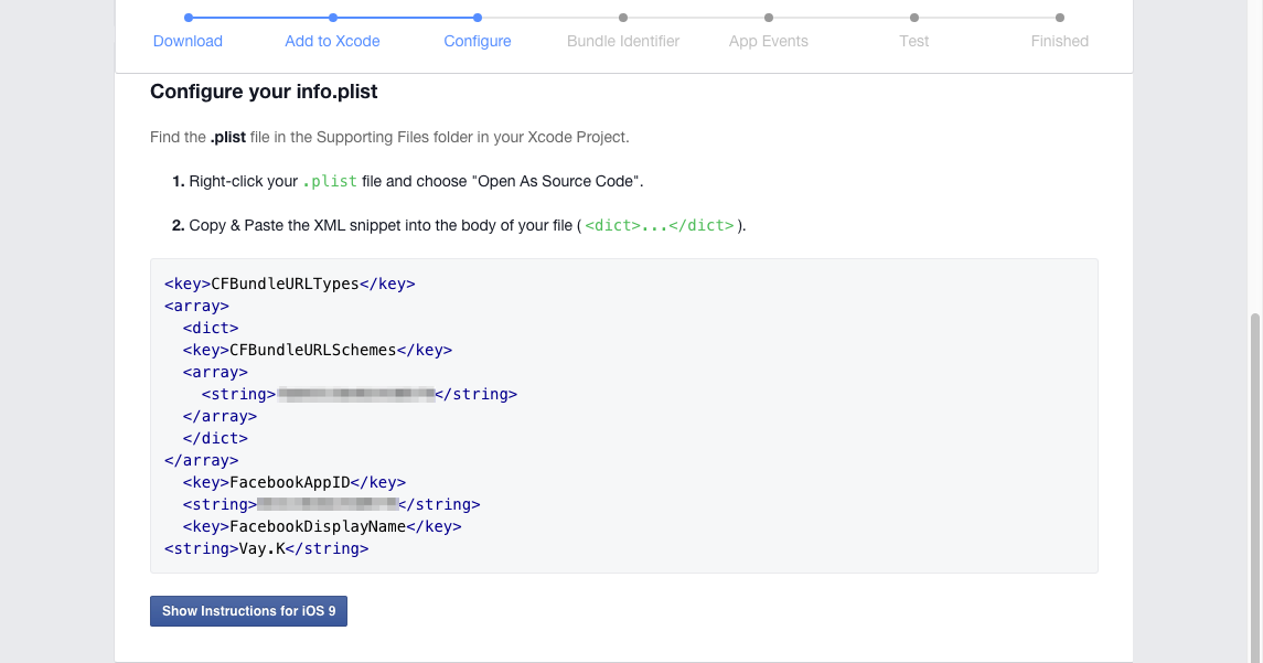 On the next page, you’ll be presented with setup instructions. Skip straight down to Configure your info.plist. You’ll need to copy the XML snippet they give you and add it into the bottom of your info.plist (it should be in the Supporting Files folder in Xcode). Make sure to right click it and choose Open As Source Code.