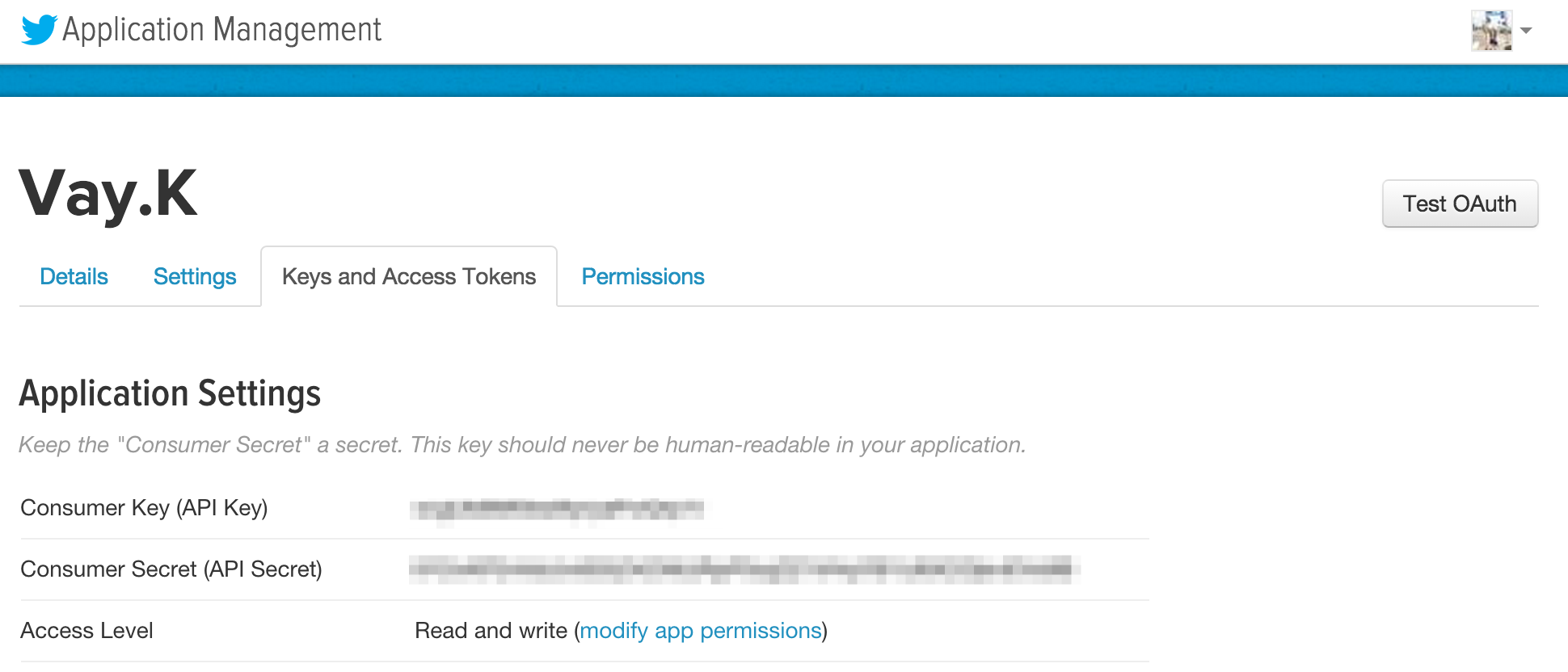 Then we configure PFTwitterUtils to get the Consumer Key and Consumer Secret. To do this, go to your twitter app in the browser and click the Keys and Access Tokens tab