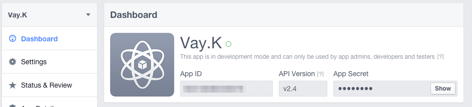 With this done, scroll all the way back to the top of this page and click Skip Quick Start. You should now be able to see your App ID and App Secret (click Show)