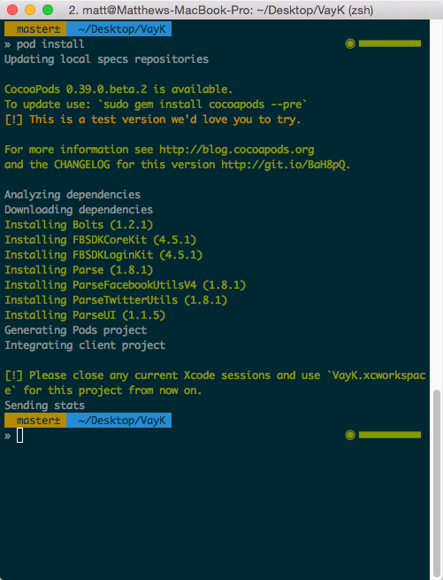 I recommend using CocoaPods to manage the dependencies. If you haven’t used it before you’ll need to install it. Open a Terminal and type: