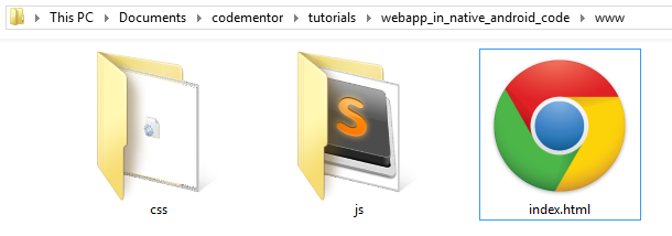 For this login sample we will create a small web application that simulates a login operation. First we need to create a www folder for storing our web assets. Then let us create an index.html in that www folder and two more folders css and js so that we have the following: