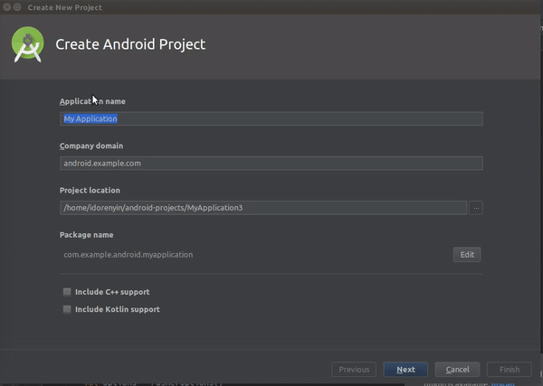 Open Android studio and create a new project. Enter your application details, include Kotlin support, choose a minimum SDK (this should not be less than API 14), choose an Empty Activity, and finish the process. Here is a quick GIF of the process:
