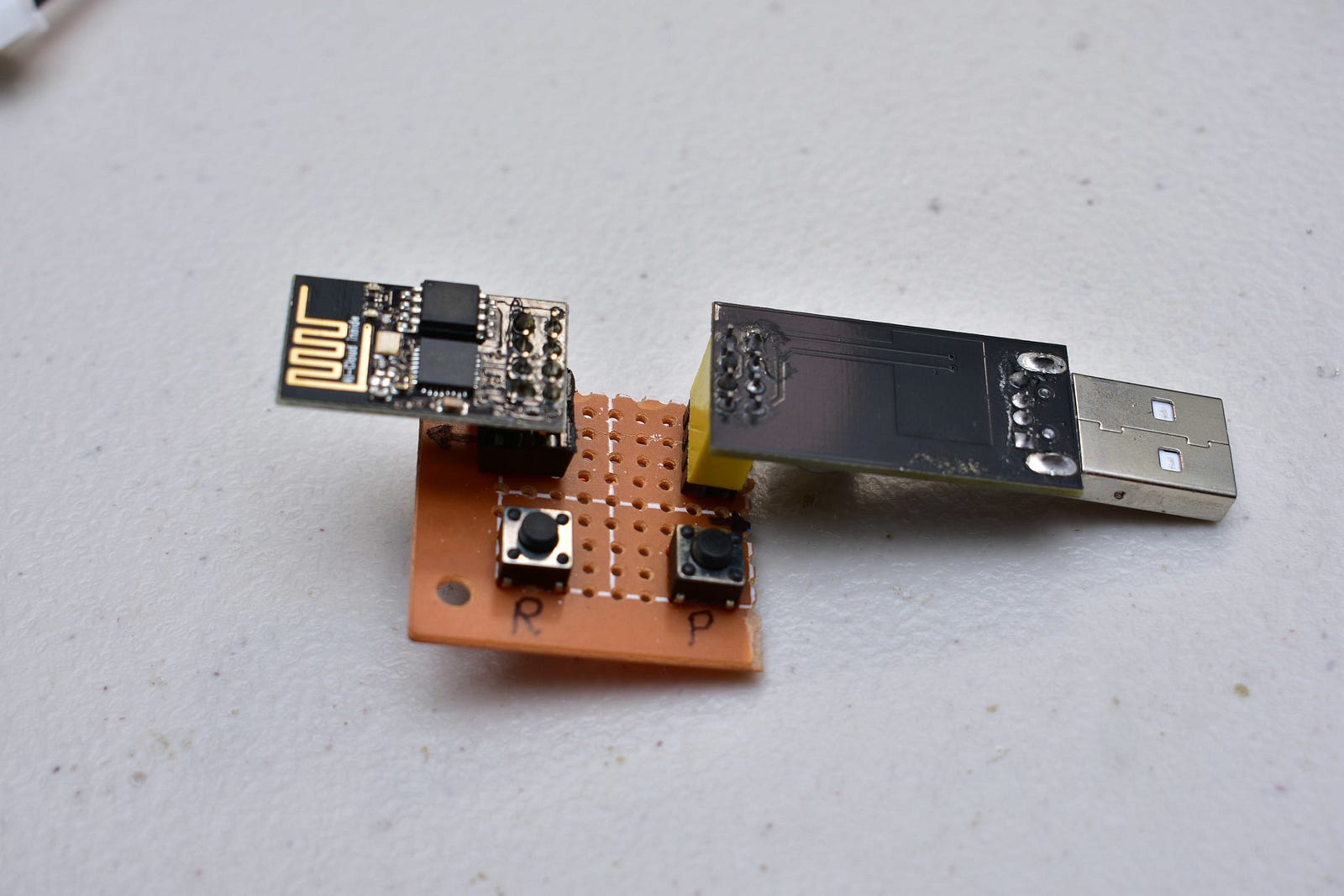 My MacGyver ESP-01 programmer with Program and Reset buttons.