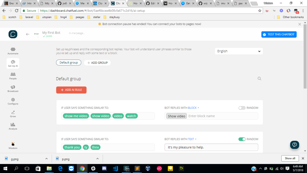 Let’s setup an automatic reply to the word “hello”. To do this: