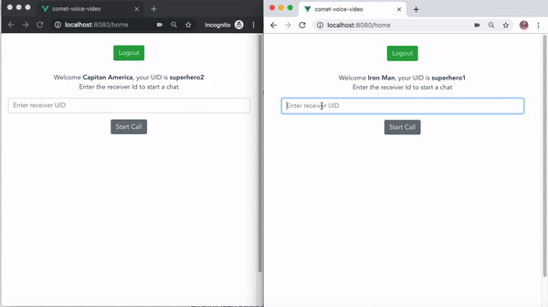 Together in this tutorial, we will build a voice and video chat application by leveraging on some of the awesome API made available by CometChat. You will be able to run this application on two separate windows(browser) locally and have the ability to make, receive and reject a call amongst other things after a successful implementation. Once we are done, you would have built an application similar to: